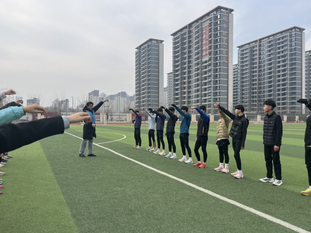 实践团队在现场设置龙舟划桨动作教学环节,面向学生开展实操教学。团队成员现场示范徒手划桨的标准动作,讲解握桨、发力、动作配合的技巧要点,指导学生逐一进行模拟练习。同时,团队在教学中穿插龙舟起源传说、聊大龙舟队夺冠故事的讲解,组织现场互动问答,学生积极参与,主动学习龙舟划桨动作和文化知识。