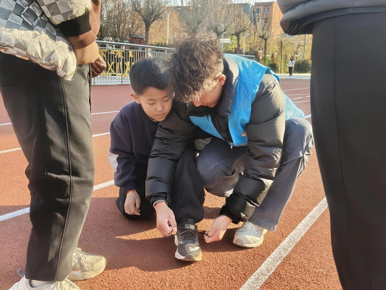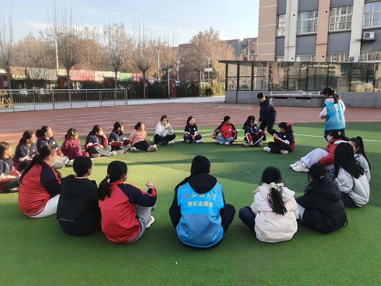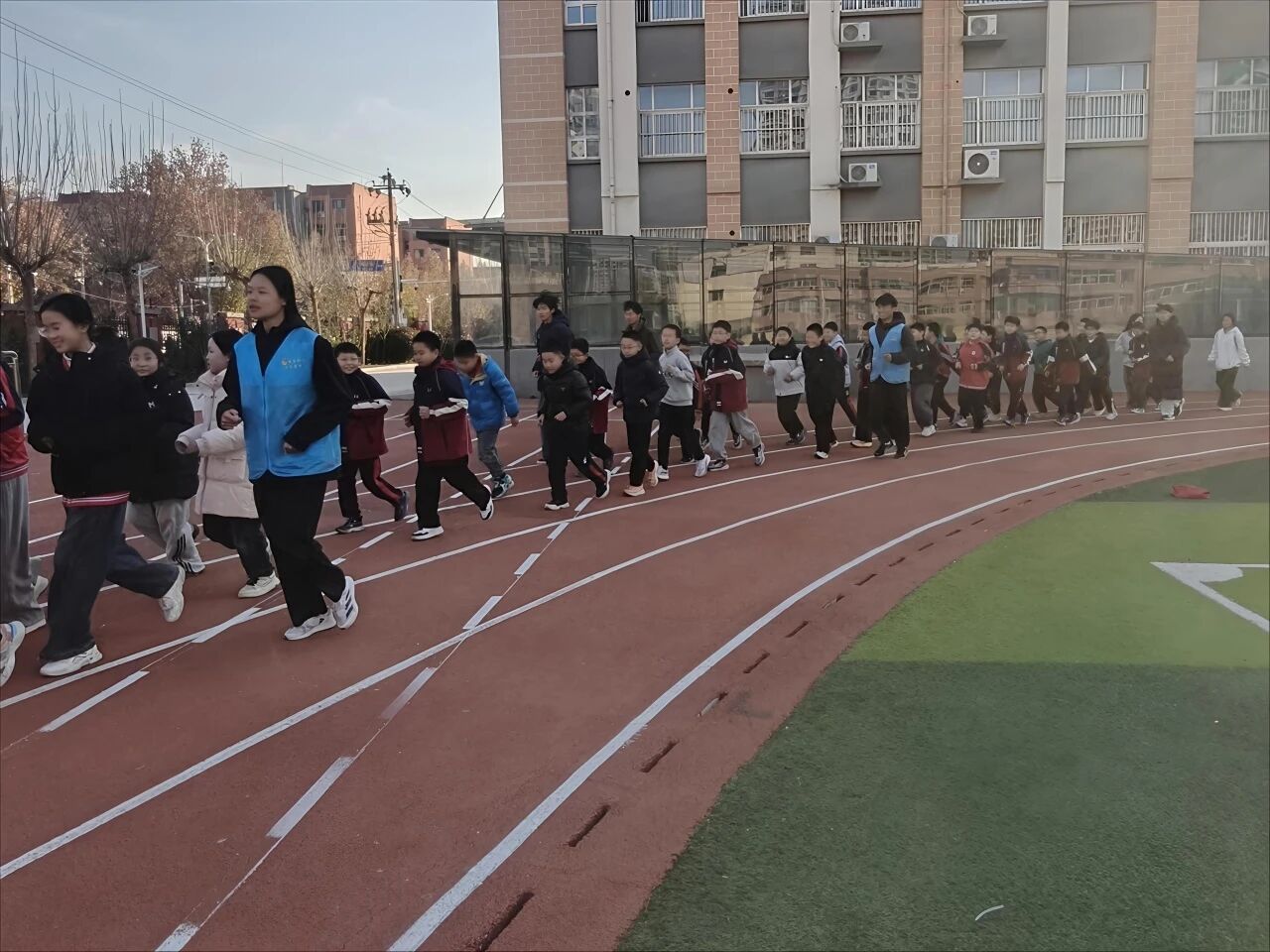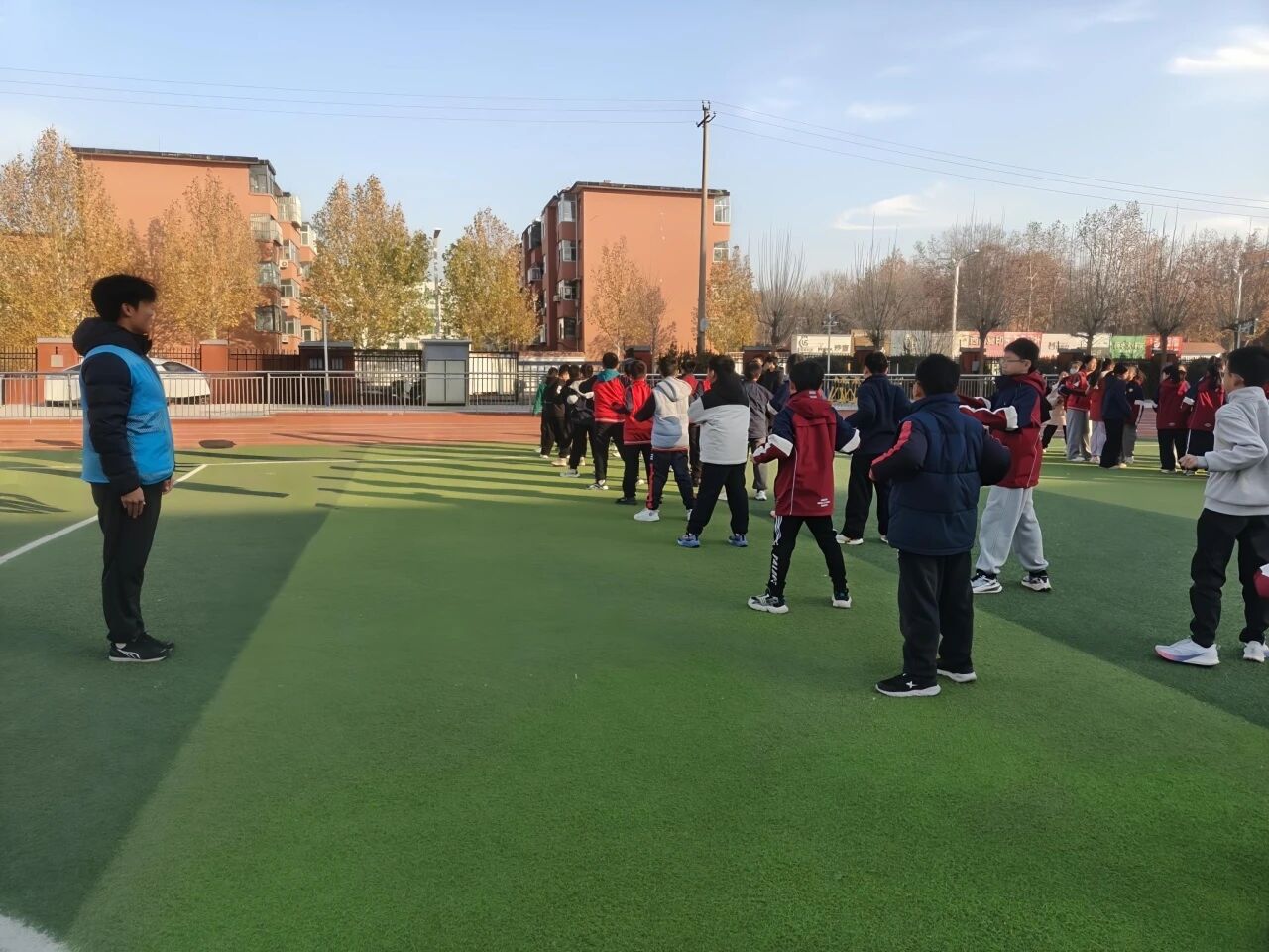 活动筹备阶段,志愿者们提前在训练区域旁搭建临时医疗点,配备创可贴、消毒碘伏、弹力绷带等急救物资,筑牢安全保障线。活动开始后,志愿者先引导学生有序慢跑热身,随后带领大家开展动态拉伸与激活训练,有效降低肌肉拉伤风险;紧接着按照“1名主带志愿者+1名辅助志愿者对应5-6名学生”的模式分组,明确主带志愿者负责训练指导、辅助志愿者紧盯安全监督,全方位守护学生训练安全。